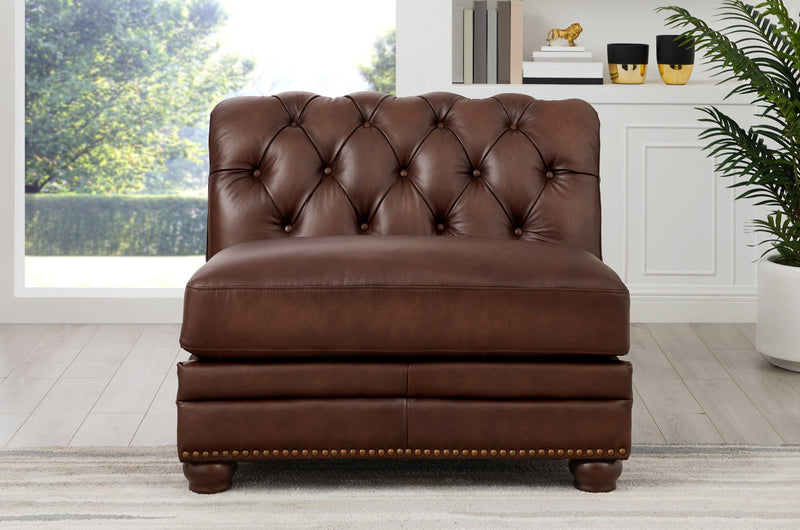 - Premium Leather Upholstery: Top-grain leather is used on all seating areas and armrests for a soft, luxurious feel. Split-grain leather covers the front rail, sides, and back, creating a durable and cohesive finish.